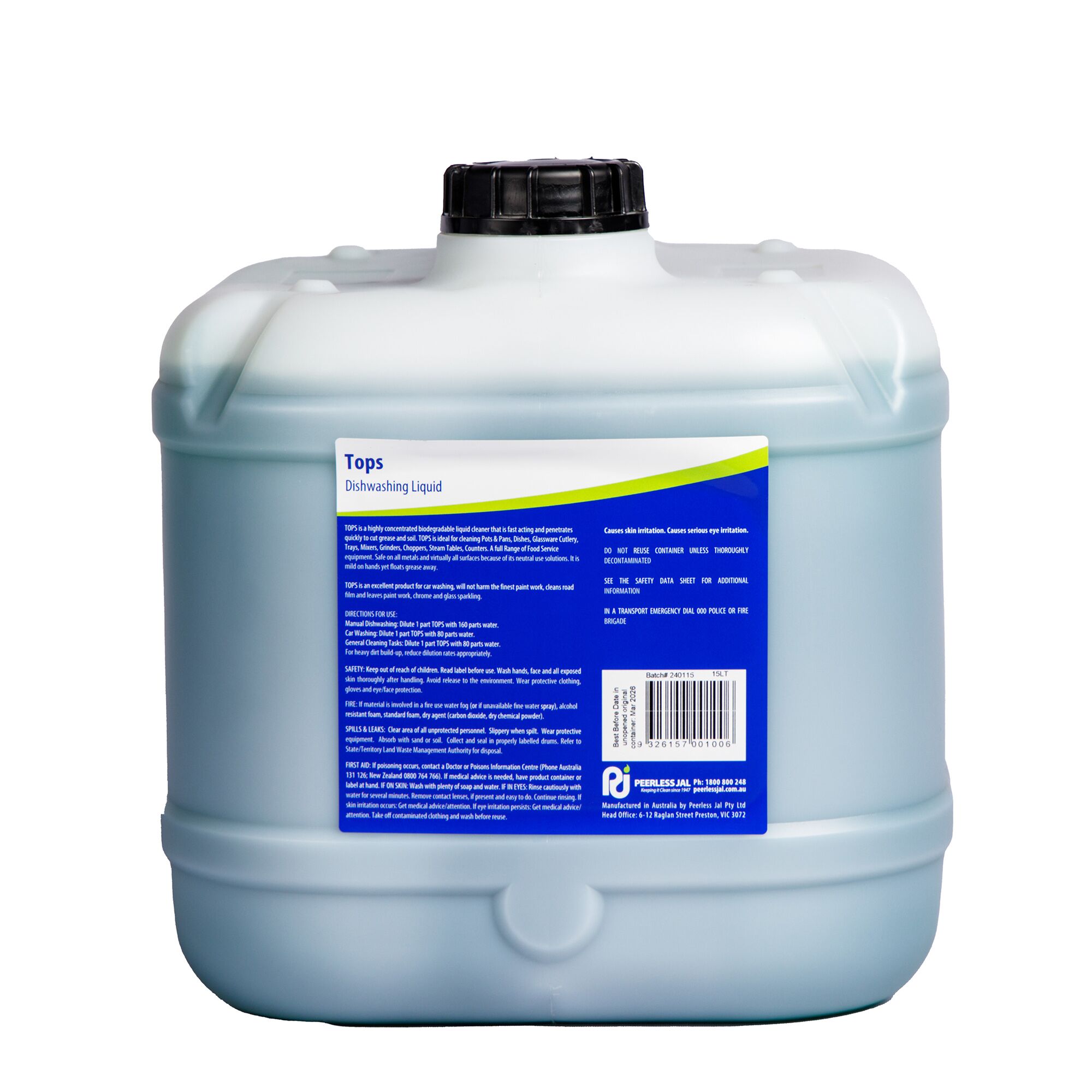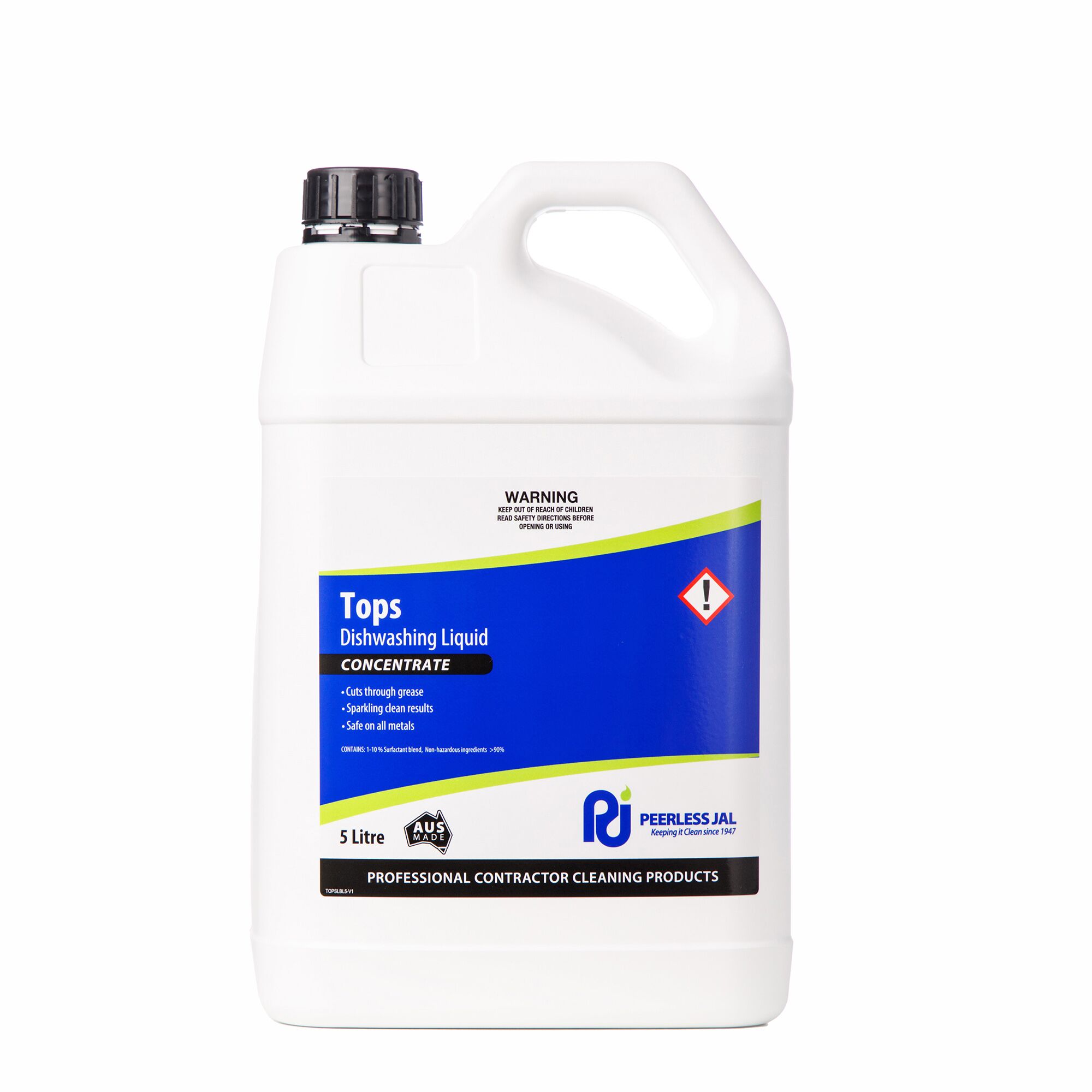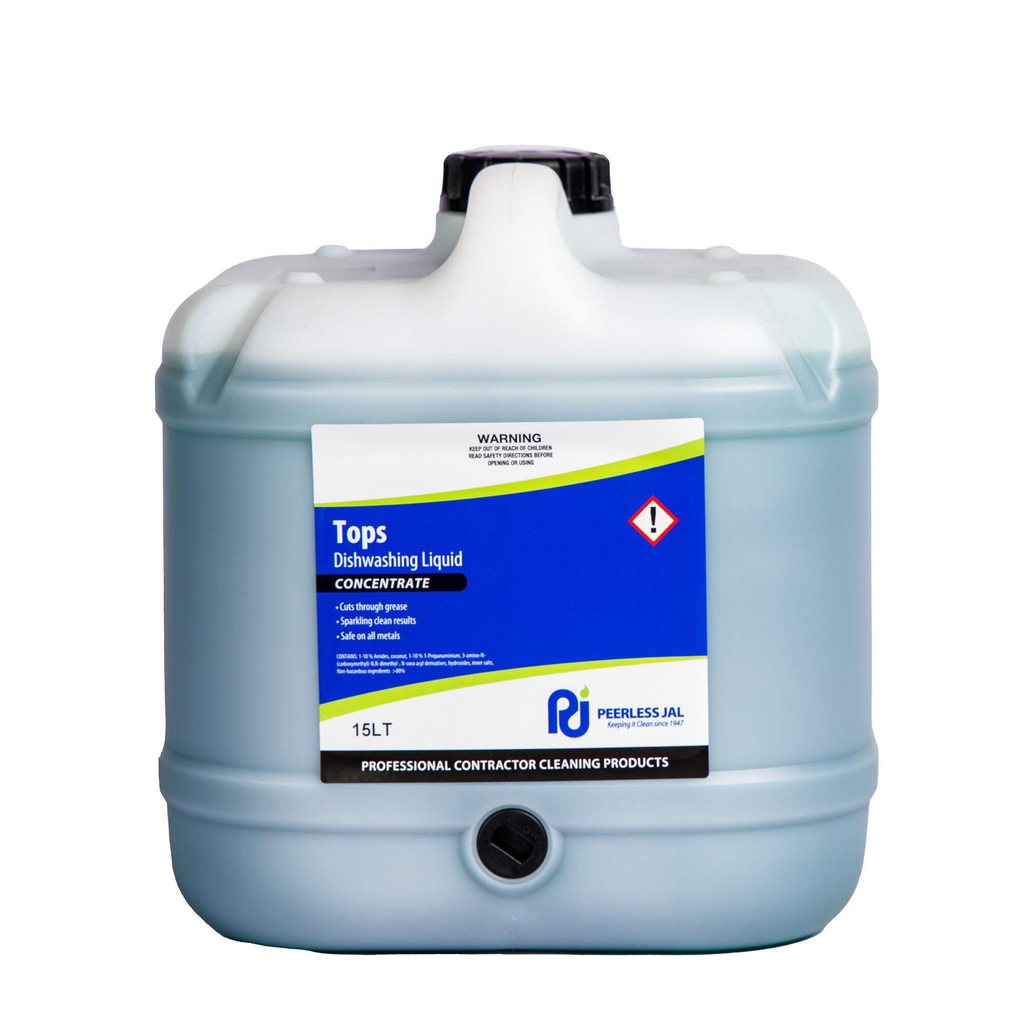 Tops is a highly concentrated biodegradable commercial dishwashing liquid cleaner that is fast-acting and penetrates quickly to cut grease and soil. Tops is ideal for cleaning pots and pans, dishes, glassware, cutlery, trays, mixers, grinders, choppers, steam tables and counters.