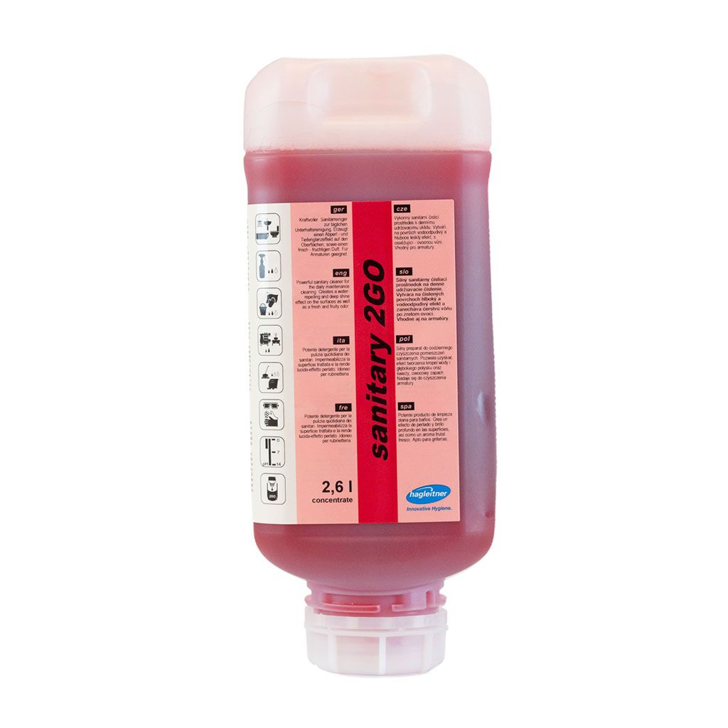 Sanitary 2GO is a powerful acidic sanitary cleaner for the daily maintenance cleaning. Sanitary 2GO creates a water repelling and deep shine effect on the surfaces as well as leaving a fresh and fruity odour.