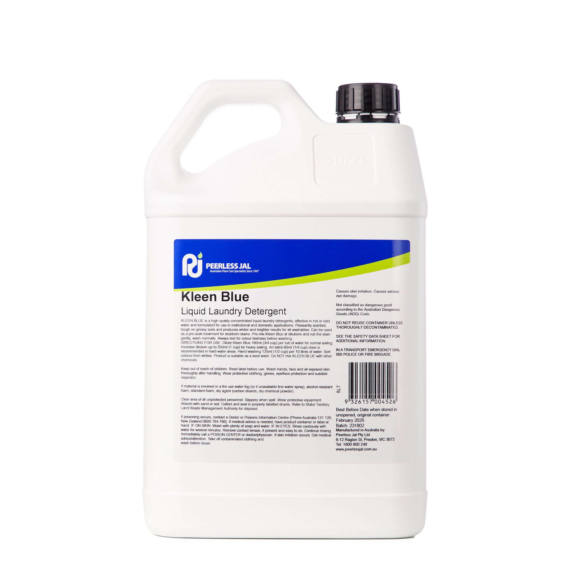 Kleen Blue is a premium concentrated laundry liquid detergent formulated for use in institutional and domestic applications. It is freshly scented, tough on greasy soils, and produces whiter and brighter results to washable linens.